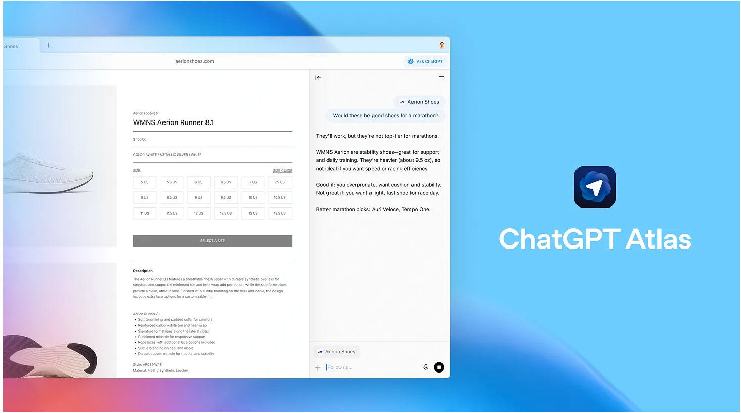 In the post, very interestingly, she shows a screen shot of a Atlas with a Comet-esque side bar and the consumer is considering buying a pair of Aerion running shoes, opens the tab and asks “Would these be good shoes for a marathon?”