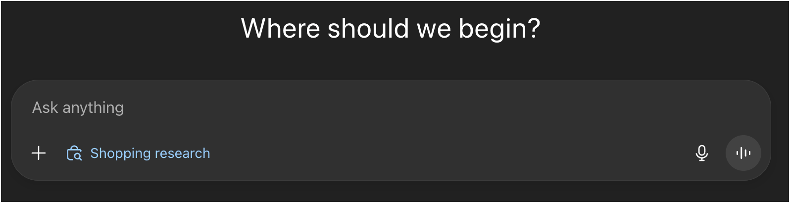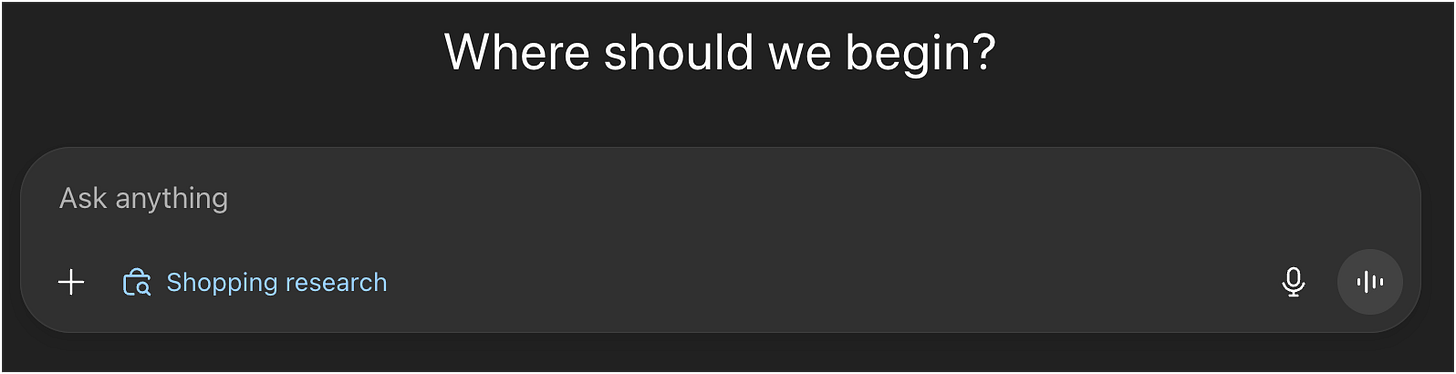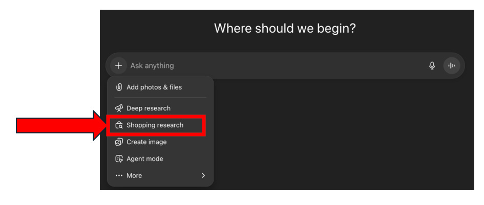 Once you’ve selected ChatGPT asks: “Where should we begin?” and you’ll see the blue Shopping Research ‘mode’ enabled underneath the prompt bar like this→