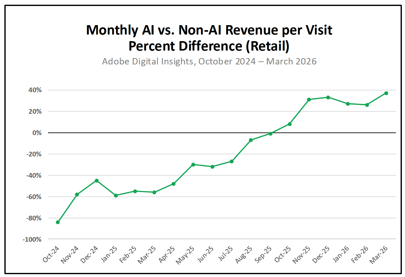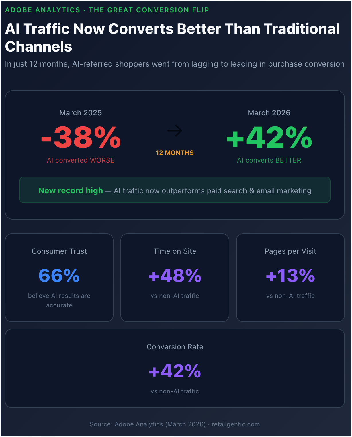 As of March 2026, AI traffic is converting 42% better than non-AI traffic (paid search, email marketing, affiliates, etc.). That’s a new all-time record in the Adobe data!