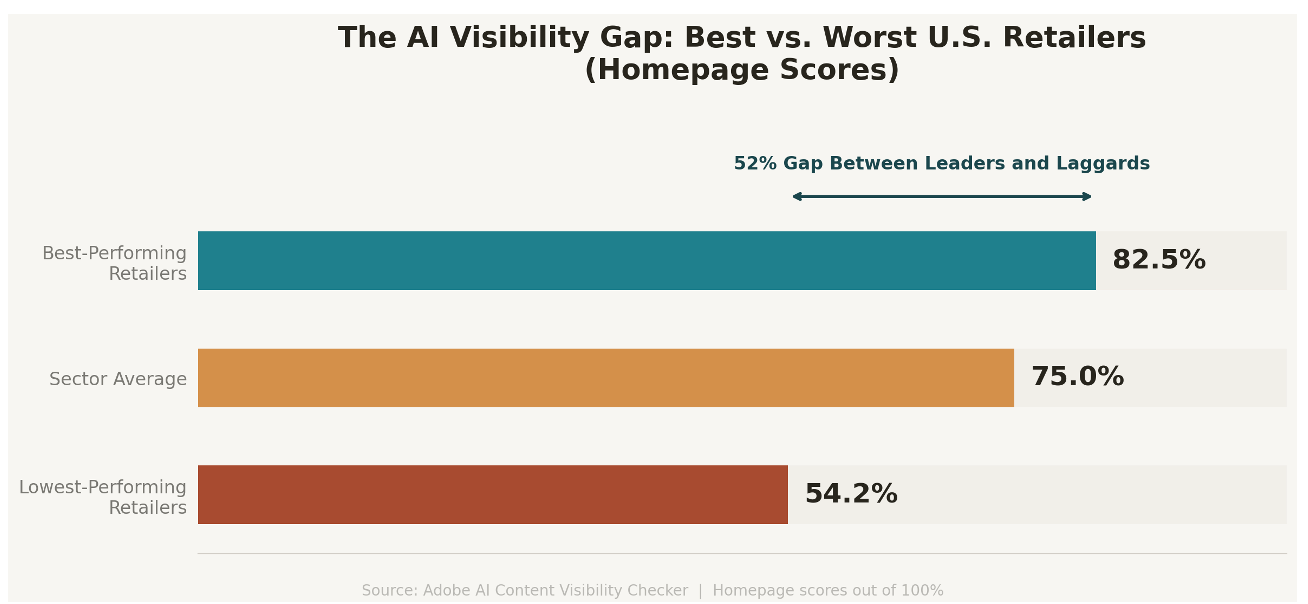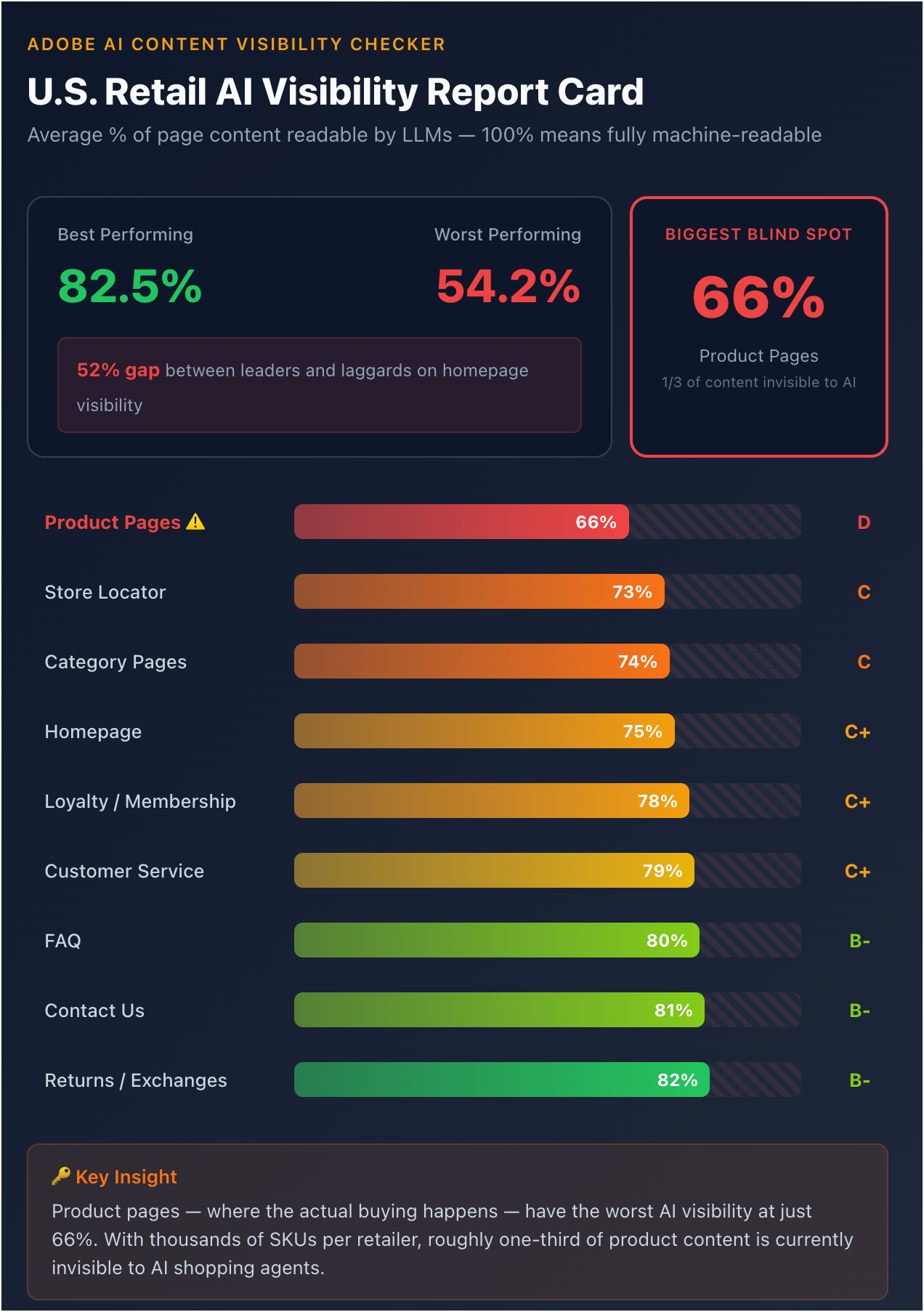 The scorecard above shows the average score across the entire retail sector using Adobe’s proprietary new AI Visibility data. We assume they are looking for the basics on each of the pages of a website: bot blocking, page readability, metadata for javascript-hidden content, etc and then rolling them up, by category, into this report-card style scoring.