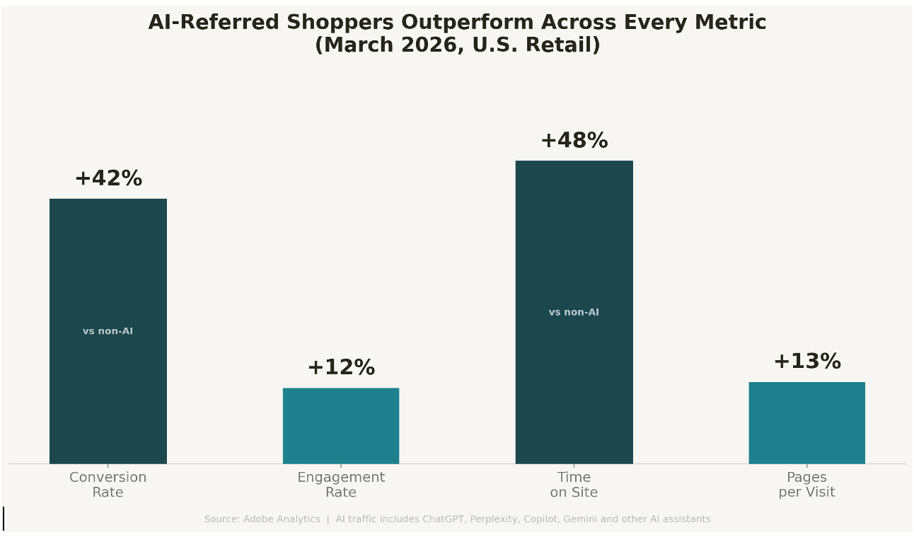It’s not just conversion. Adobe’s March 2026 data shows AI-referred visitors outperform across the board:
