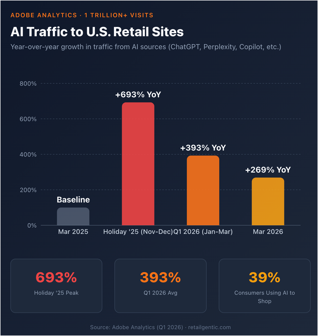 In Q1 2026, Adobe reports traffic from AI sources to U.S. retail sites jumped 393% year over year. In March alone, it was up 269%. As a reminder, during the November-December 2025 holiday period, AI traffic surged 693%.