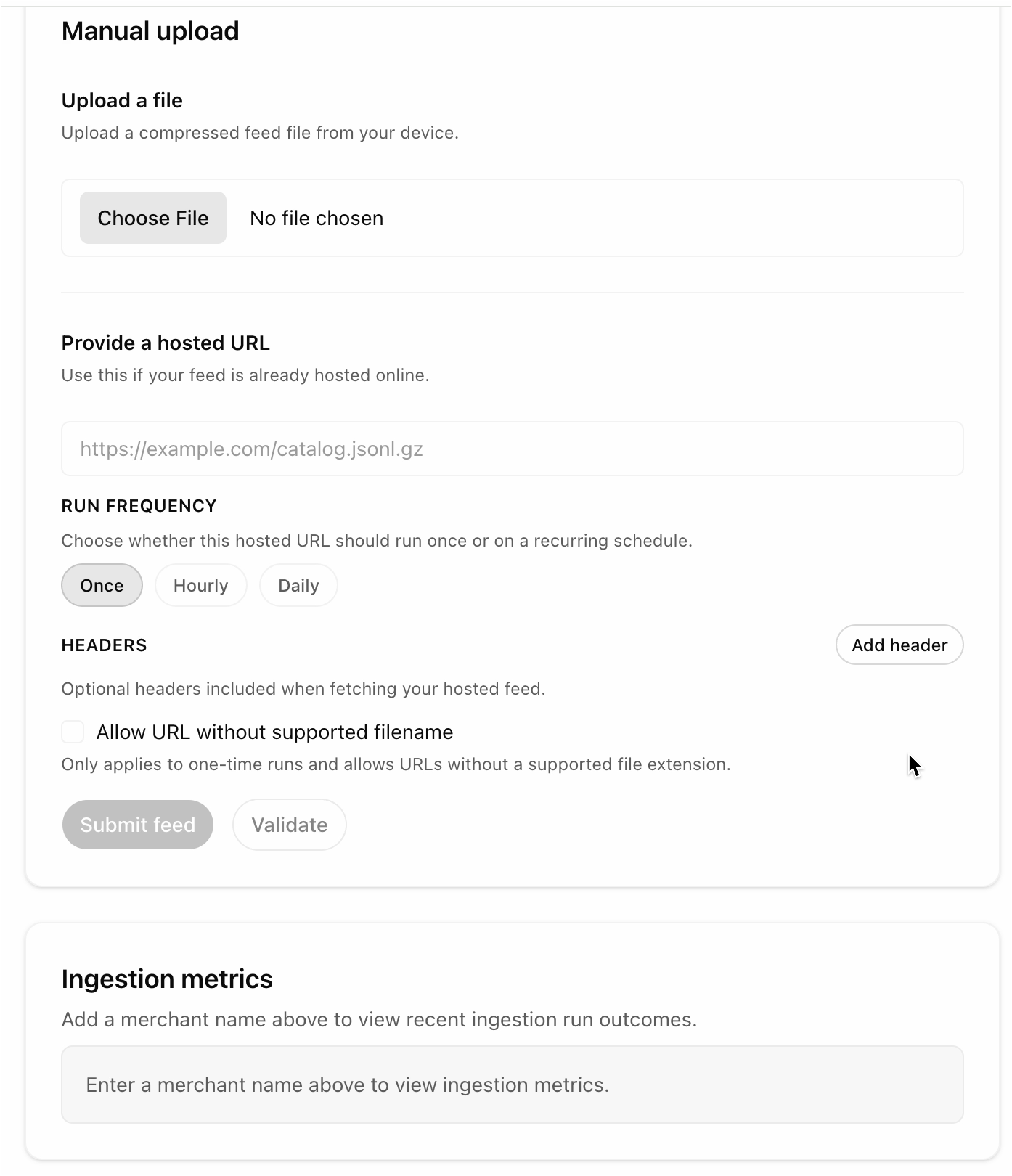 In ecommerce when a consumer platform wants a product catalog from a brand or retailer (Merchant) we stand up a Merchant Center. The Merchant Center gives them a user-interface to sign-up, then see the datafeed specifications, upload data feeds, come up with permissions to keep it all secure. Sometimes it includes a sandbox to try a datafeed, etc.