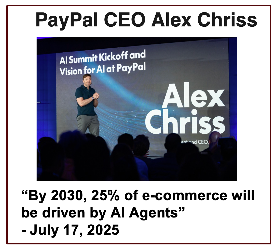 PayPal CEO, Alex Chriss has been very bullish on Agentic Commerce (and he’s not tied up on the ‘right’ definition I’ll add for all you Naysayers out there). Back in July he predicted: