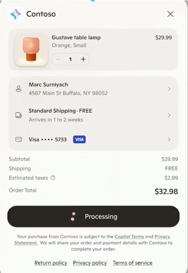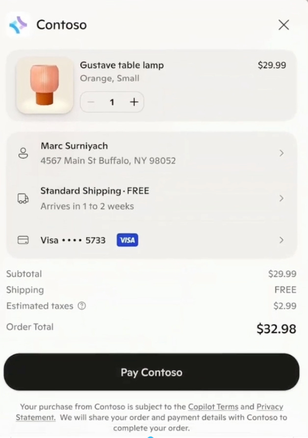 Just like Instant Checkout, it’s quite clear that you are transacting with the merchant, Contoso, NOT Stripe or Microsoft Copilot.