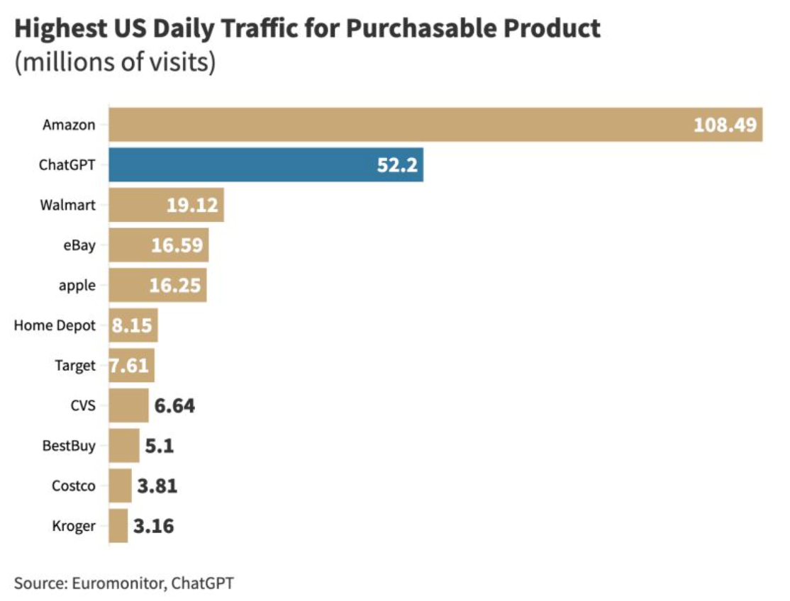 Euromonitor took that and figured out the Daily traffic for the top 10 retailers. the results show data that ChatGPT has had for a while: They are the 2nd most visited ecommerce site.