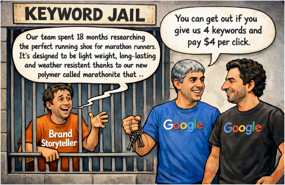 One day you wake up…it’s 25 years later and realize we’ve gone from storytellers to keyword optimizers/buyers. That is Keyword Jail. There’s other implications too on how we think about products and even how we design and build products.