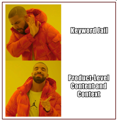 Conversely, back in keyword jail, it’s like taking your best sales rep that knows all about your products and letting them ask one the shopper one question that they can only answer with less than 5 words. Sounds crazy, but that’s exactly where we’ve been with keyword jail.