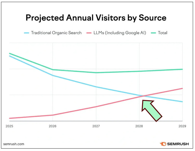The green arrow (added by me) shows a point in time that SEMRUSH predicts that traffic will cross from majority Traditional Search and be Majority LLMs (including Gemini). Here in 2026 that sounds far away. Ex-Googler, SEO/SEM guru now popular author of a top SEO/SEM newsletter is consistently predicting 18-64% decline in 2026.