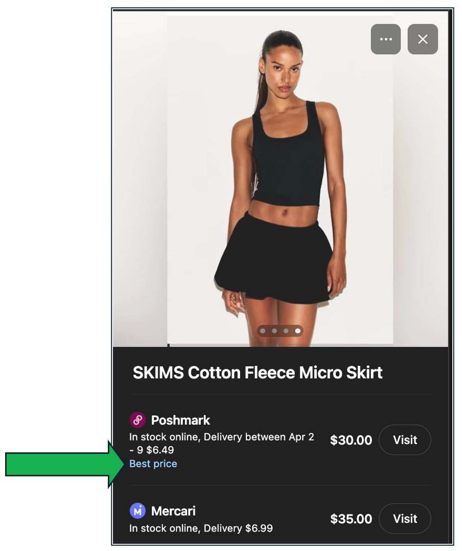 Here you’ll see are two offers Poshmark at $30 and Mercari at $35 and Poshmark has the new “Best price” call out. Note that it does seem to take into consideration pricing and only showing up if the price difference is well north of 10% savings. I’m sure this will be tweaked a lot over time.