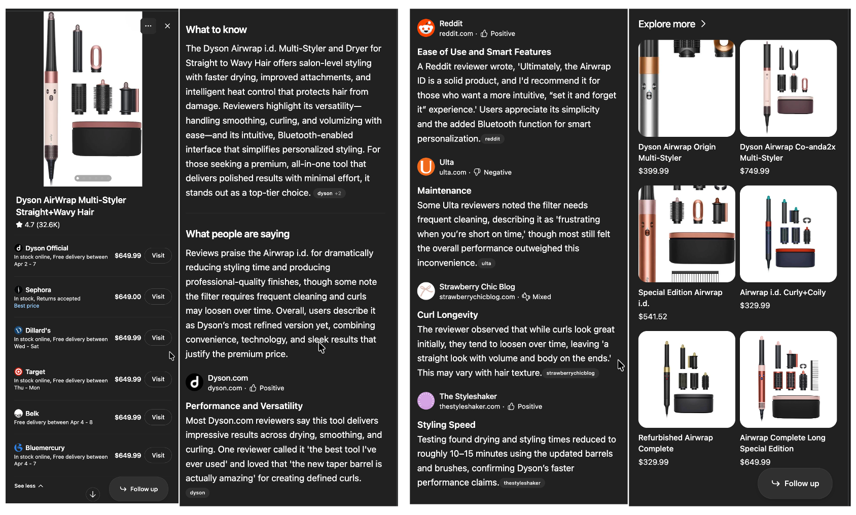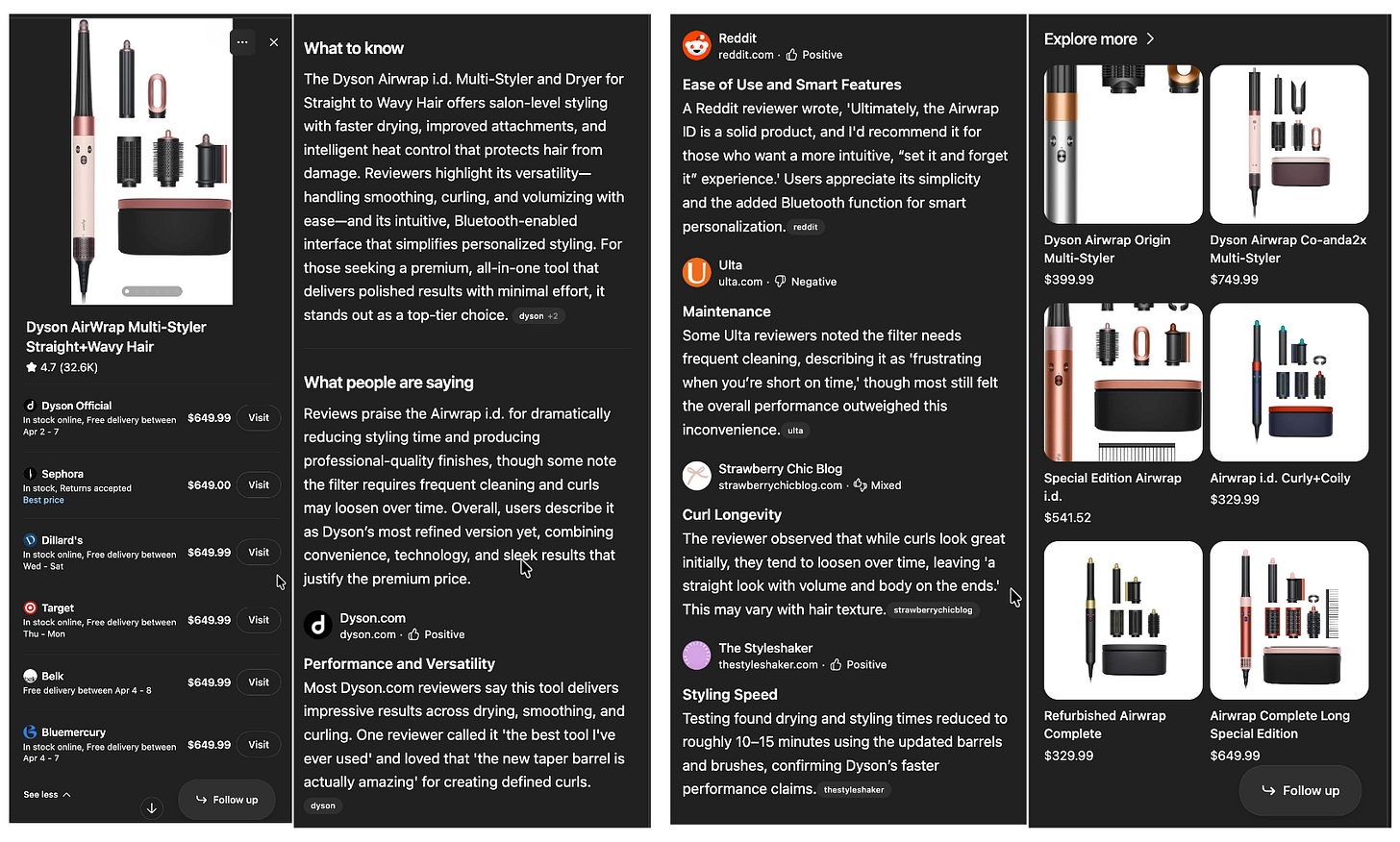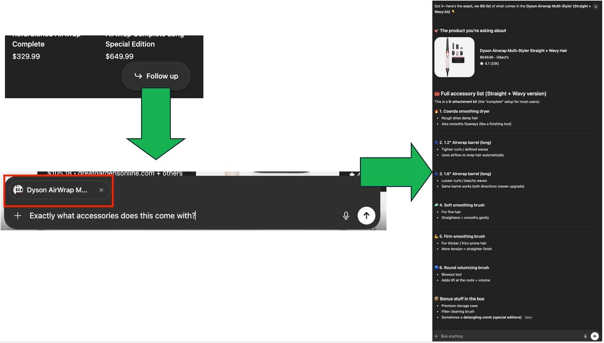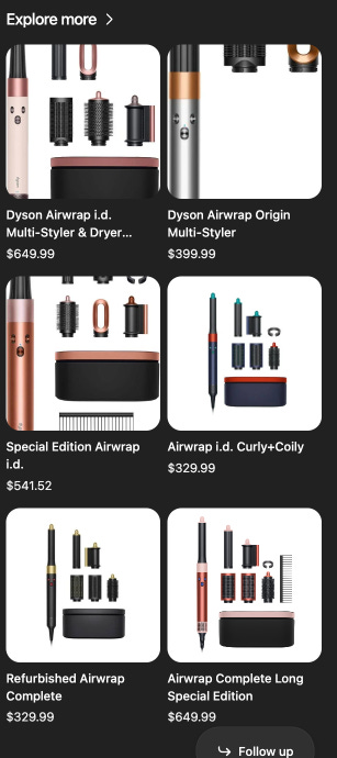 In this example, I’m looking for a Dyson Airwrap and got confused about which accessories come with this SKU. When you click on Follow-Up, it has this hovering pop up chat that has ‘selected’ in it (see red box) the SKU in question - a visual clue we are asking about this specific product’ and I ask my question. Then the answer, also in the hovering box is presented. This is pretty cool to see in practice and I now want to put 3 of them in there like Rufus and Gemini have and see how that works. It seems like the comparison matrix would be a great place to put some check boxes and when you check them it puts them into this type of setup.