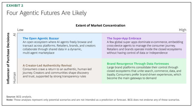 I thought this BCG article was pretty interesting and had some thought provoking scenarios and likely conclusions for how Agentic Commerce plays out. Here’s an example - they have this diagram detailing four possible agentic futures→