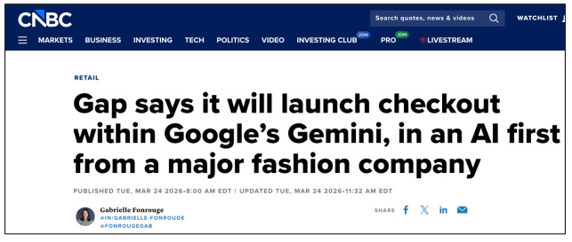 Tuesday, on-stage at Shoptalk, the GAP’s EVP and CTO, Sven Gerjets was on stage with CNBC’s Gabrielle Fonrouge and they announced that they are the first major fashion brand to jump in feet-first with Gemini/UCP.