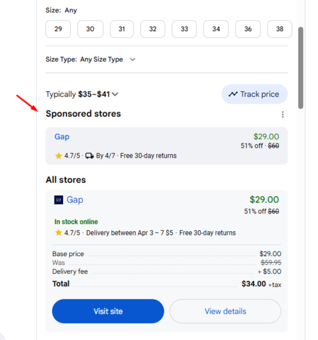 In this example, Gap is the only merchant with the offer, so they are effectively listed twice. If we pretend that StoreX also had this item, but wasn’t sponsored, they would be listed either above or under the ‘All stores’ designation. This is a pretty valuable ad unit, it’s way up top, very delineated and basically doubles your shelf space. It will be interesting to see how it’s priced and how retailers are going to be thinking about the ROAS on this one.