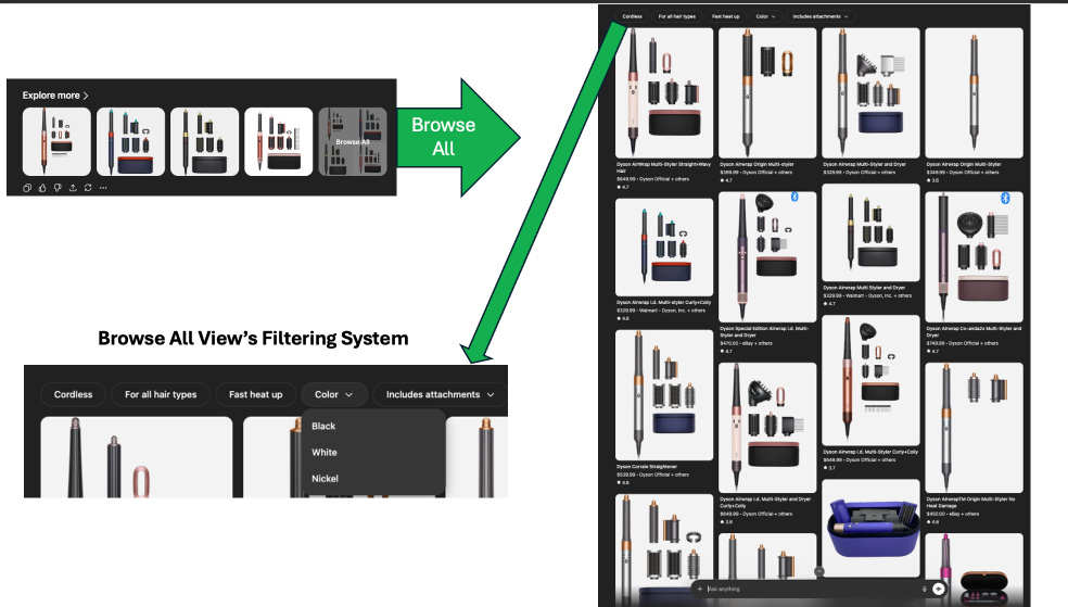 Sometimes you even get what we’re calling the “Browse All View’s Filtering System” at the top that lets you filter what shows up in the product wall based on various attributes provided (I’ve popped down the color menu in this Dyson Airwrap example