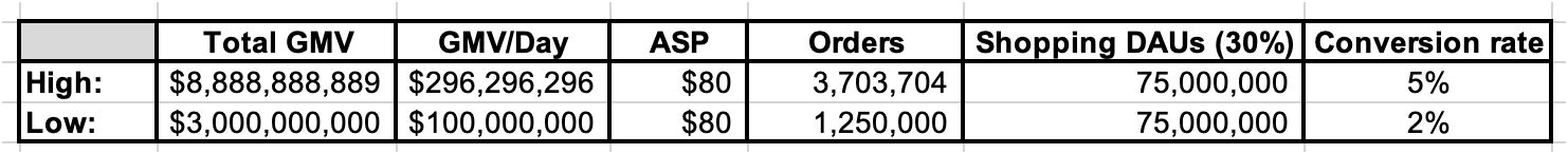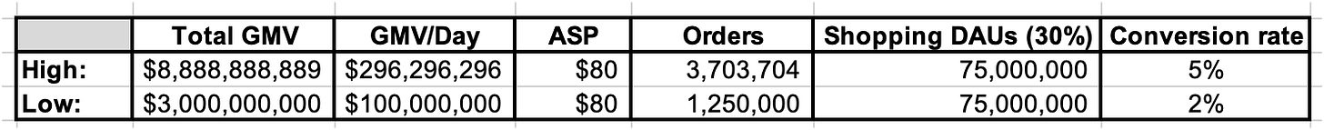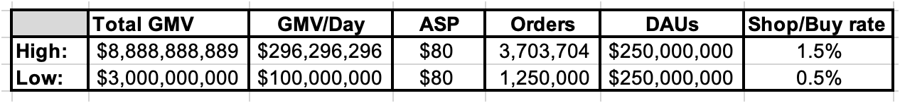o We then do a sanity check - how many people have to both shop and buy a day as % of those DAUs -for example, if this ‘top down’ model (GMV→user activity) spits out 50% that would be crazy high. This comes out to a range of .5%-1.5% which honestly doesn’t seem crazy to me, however, it would be cleaner to split that out to two stages, shopping and then converting. Let’s do that→