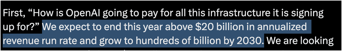 Here you can see that OpenAI is showing $27B in 2026, well entering the year at ‘over $20B’ at a 400X curve makes me think that $27 could turn into…$40? $50? IDK, we’re living in a world that’s entirely unprecedented and thus unpredictable.