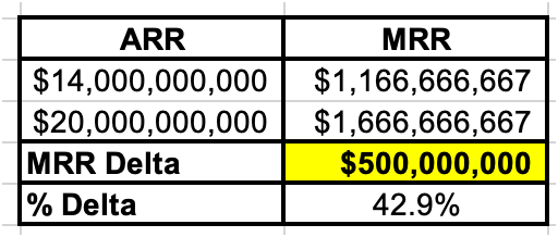 Let’s assume all along we’ve been talking about $14B ARR 2025 exit-velocity and now that is $20B, in subscription revenue it’s easier to deal with MRR so let’s convert to that, look at the monthly revenue increase (delta):