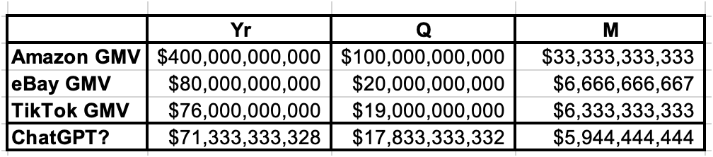 But, we’ve also never seen a company get to 1B MAUs this fast, all the data is it is closing in on big apps like TikTok. TikTok’s user→buyer conversion should be much smaller because the % of people using it to shop is tiny vs. ChatGPT at 80% now.