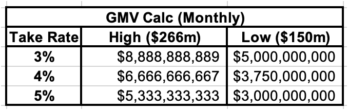 We know have everything we need to calculate a range for GMV. Here we take the low/mid and high end of our Take Rate and we then take our High and Low of our revenue ($150m-$266m) and we use the GMV formula above to calculate GMV/month→