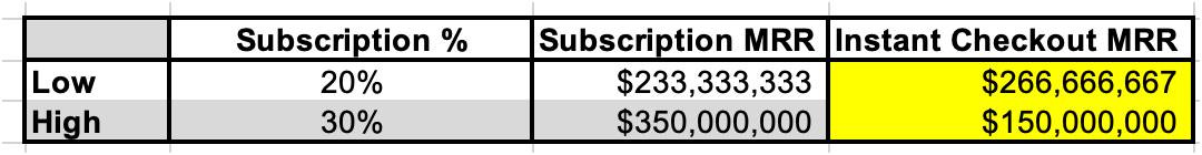 We now know enough to estimate where the new $500m/m is coming from: Subscriptions and Instant Checkout. For this thought experiment, let’s say subscriptions grew enough from the $14B run-rate to take up 50-75% of the 43% increase in revenue: