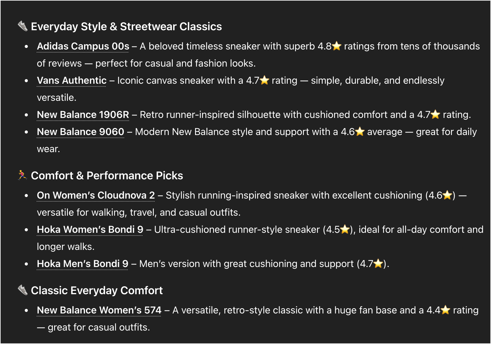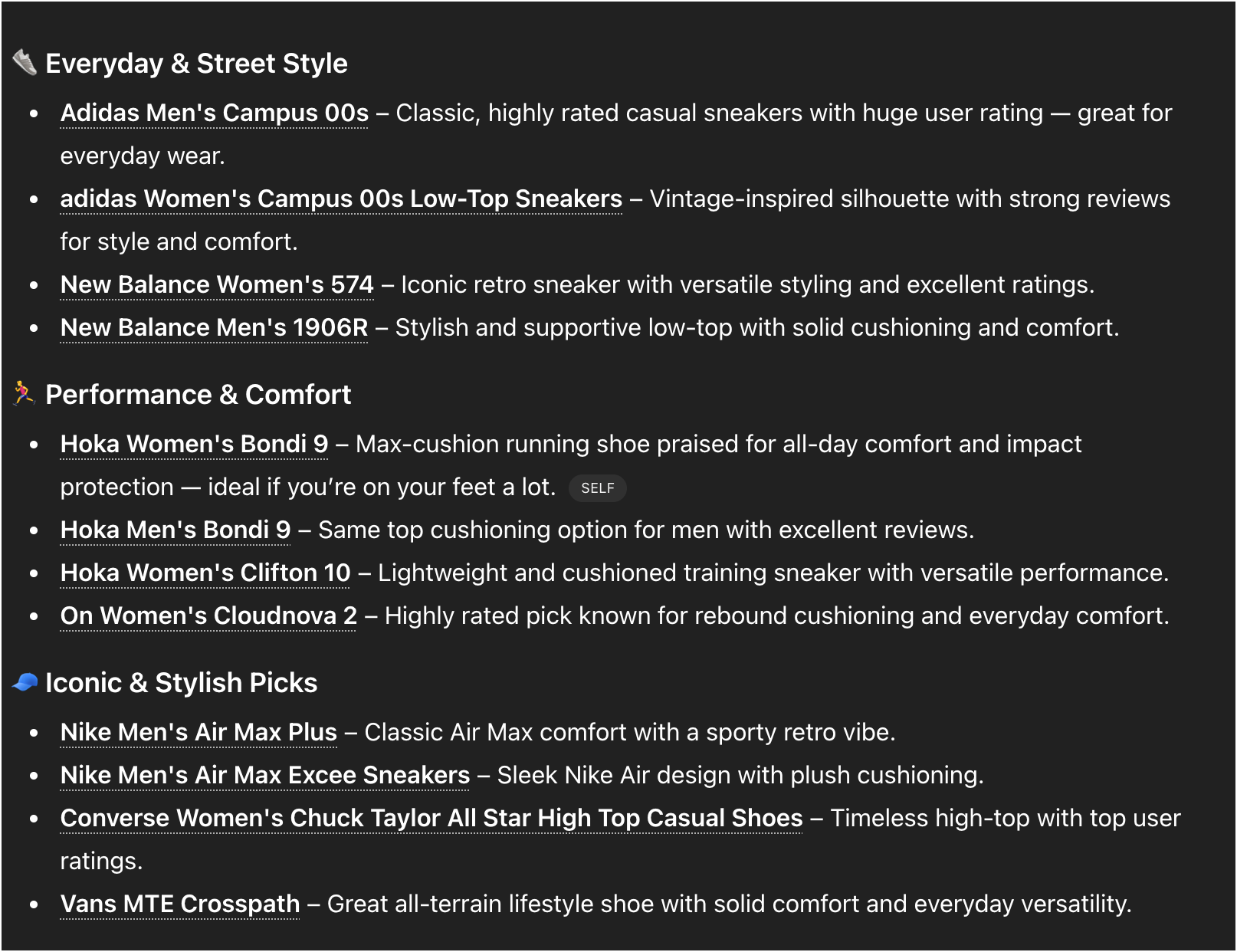 Advantage New Balance - right? Hold the Batphone - that’s keyword jail thinking. We don’t live in that world anymore. Let me illustrate. In the account above, I run a lot of searches for new balance and hoka - so that’s in my memory along with a LOT of other elements. I have an unusually large number of ChatGPT accounts and here’s the results from a different account.