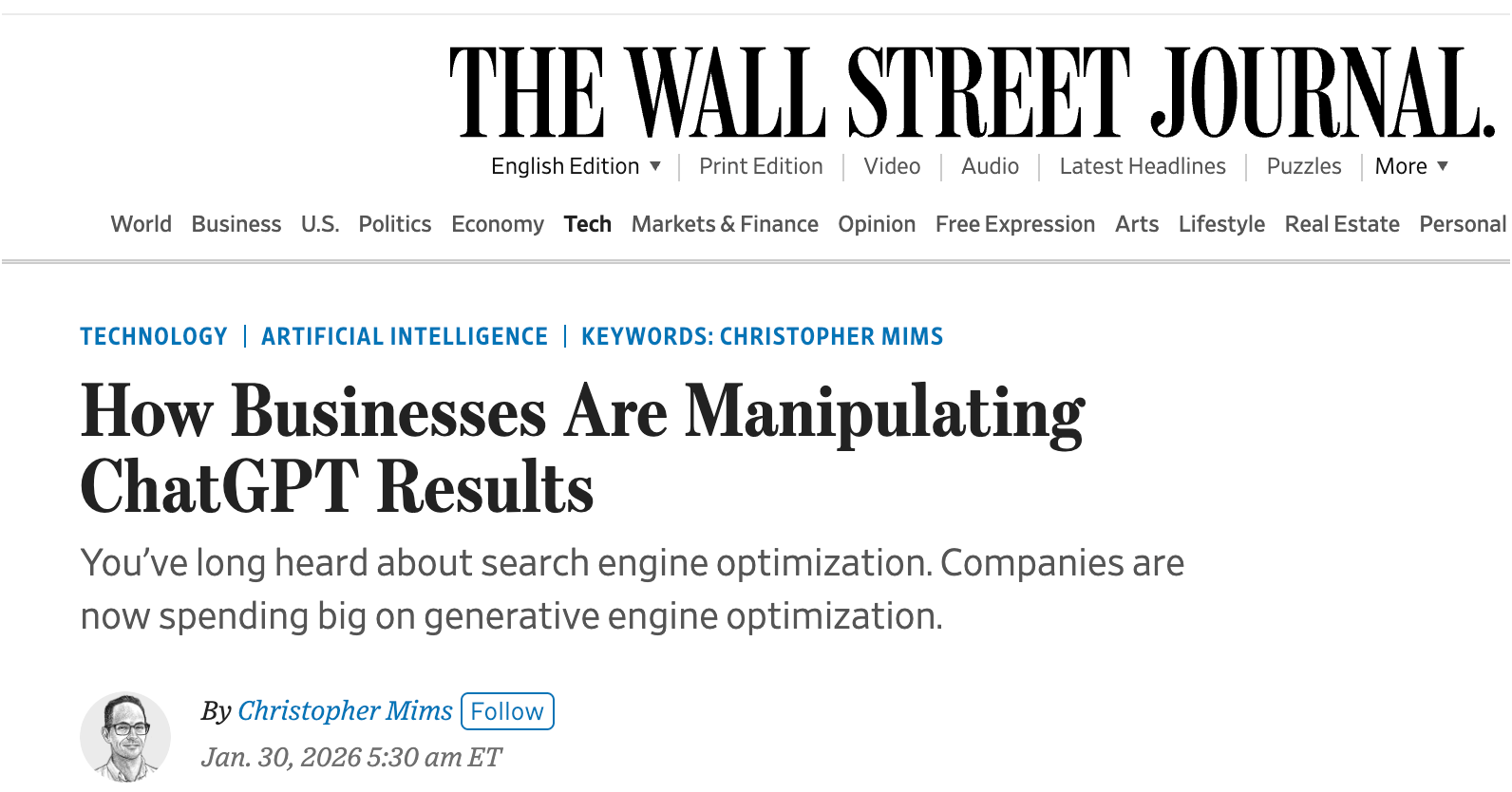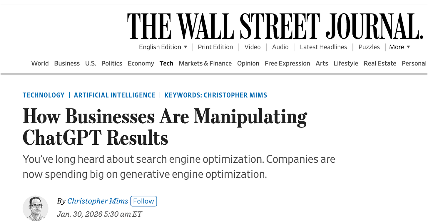 WSJ this week had a great piece here, where they detail how one firm, First Page Sage is manipulating ChatGPT (sadly the reporter didn’t tie it to black hat SEO which it clearly is).