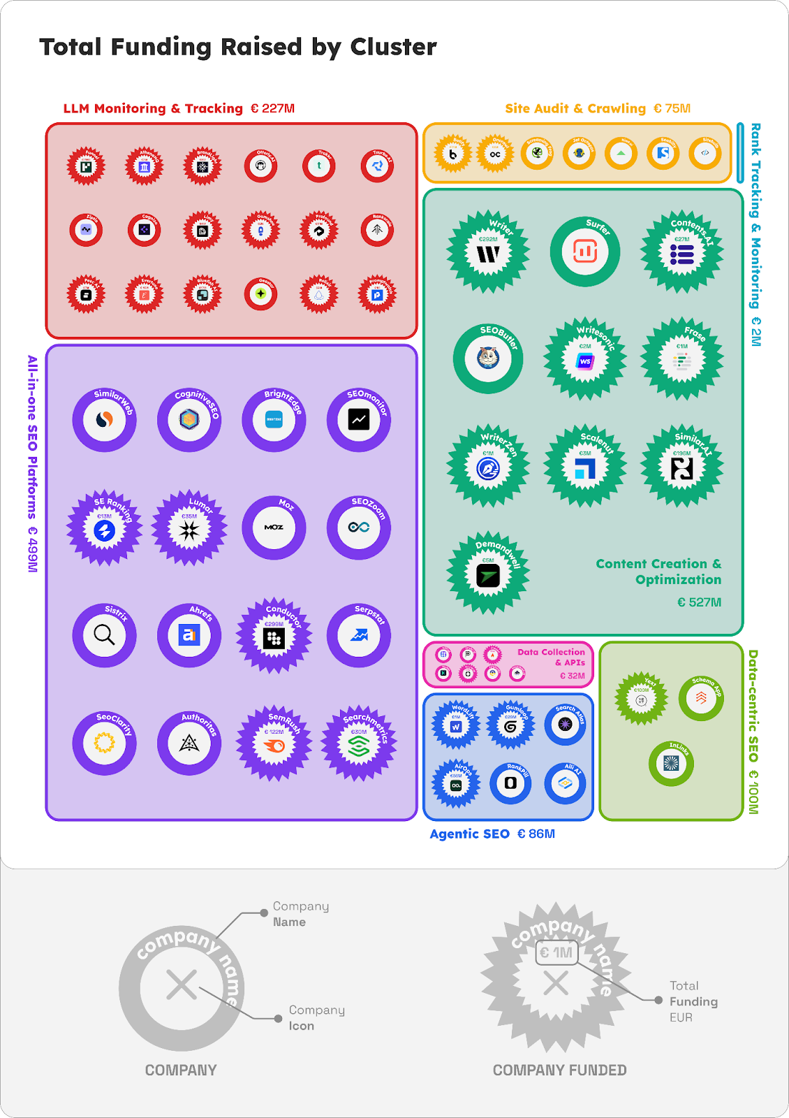 To get into the Trough of despair, you have to start with a really inflated expectation wave. Kevin Indig has a substack for tech companies focused on trends in Growth/Go-To-Market and he had a great article called “The Alpha is not LLM Monitoring”. where he details the problems of the ‘AI Visibility’ category of startup that now has raised over $227m across 60-100 startups. He has this handy graphic clustering them into 9 sub-categories and if you zoom in the company name and amount raised are around the edges.
