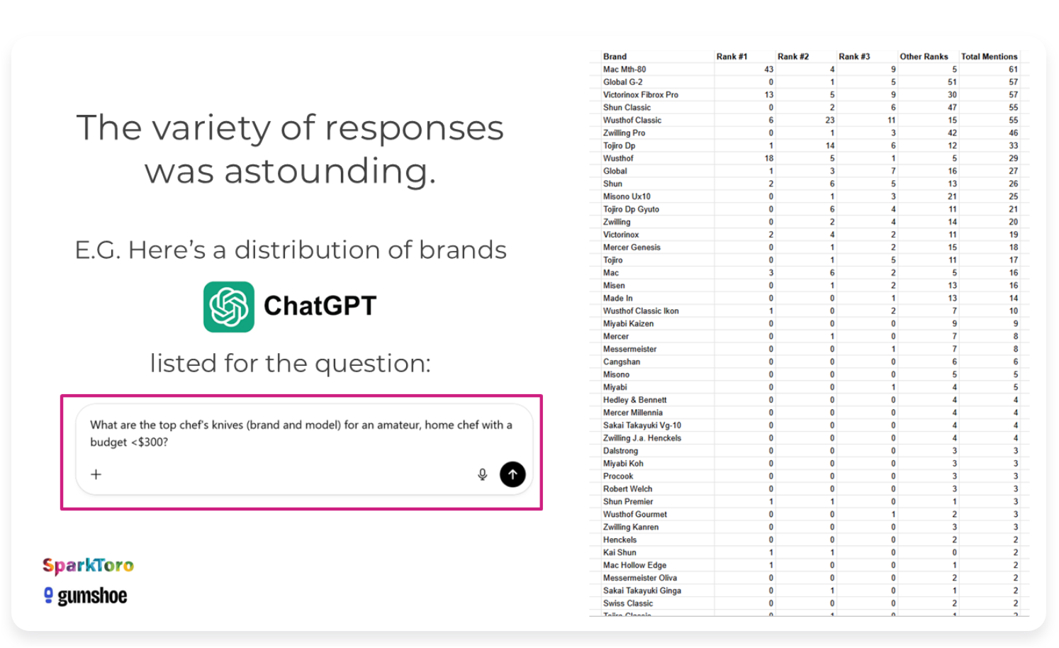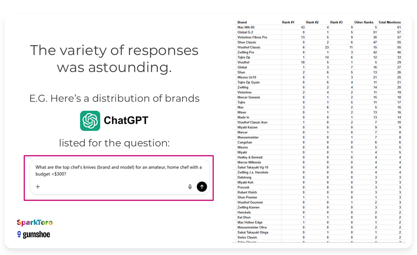 They asked 600 volunteers to run 12 prompts each - sadly only one was really ecommerce related (grr) and it was for prompt (I don’t think anyone prompts like a data scientist other than, well data scientists, so that itself is suspect, but ok). The prompt: “What are the top chef’s knives (brand and model) for an amateur, home chef with a budget < $300?”