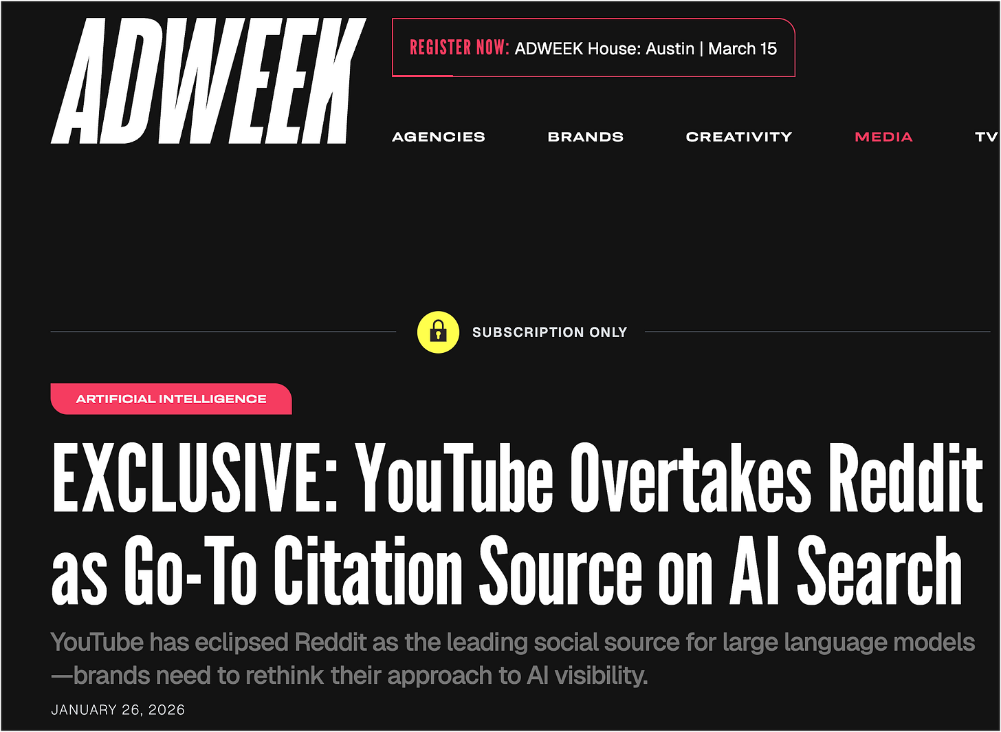 This week Adweek has ar eport out from one of the GEO/AEO tool companies that, hold on, hold on. Reddit is OUT an Youtube is in! (article here - paywalled).