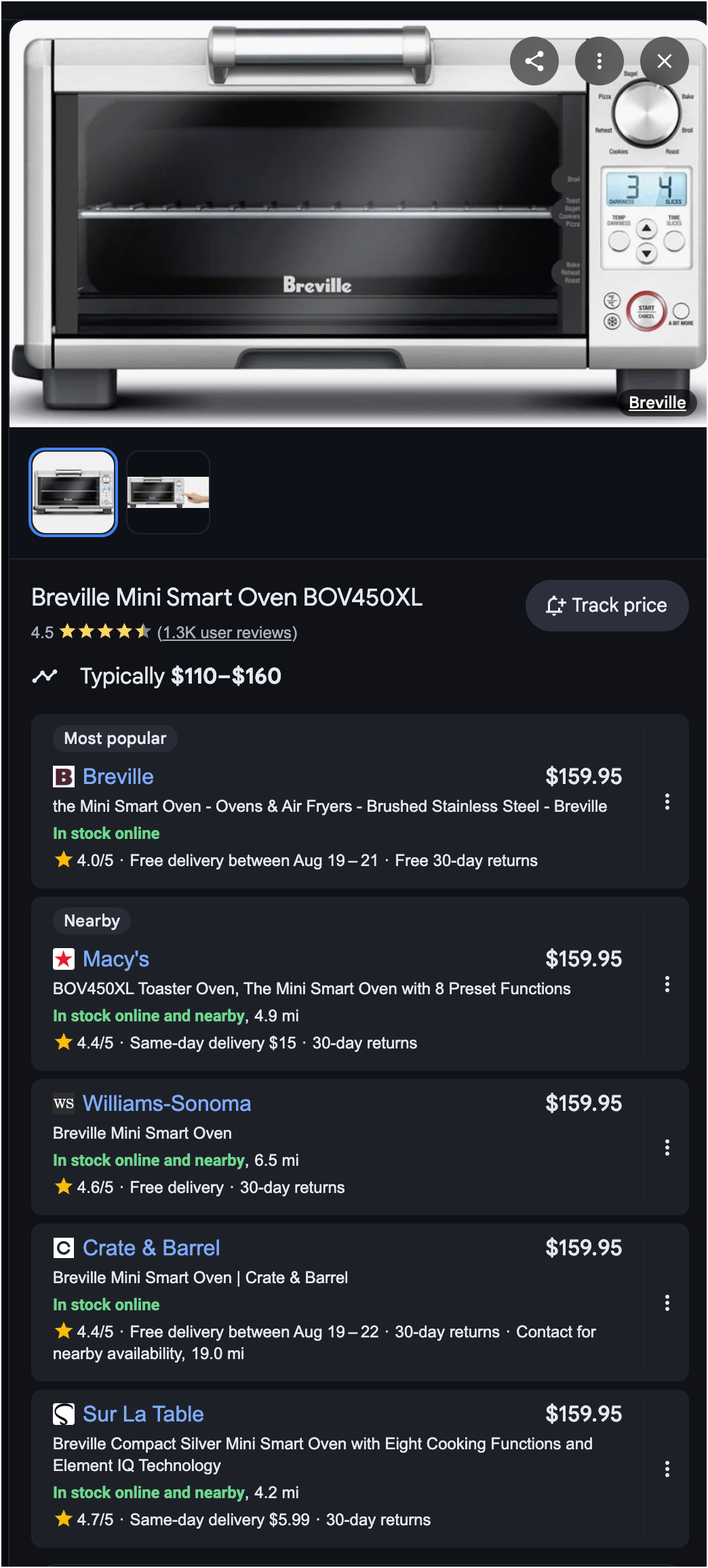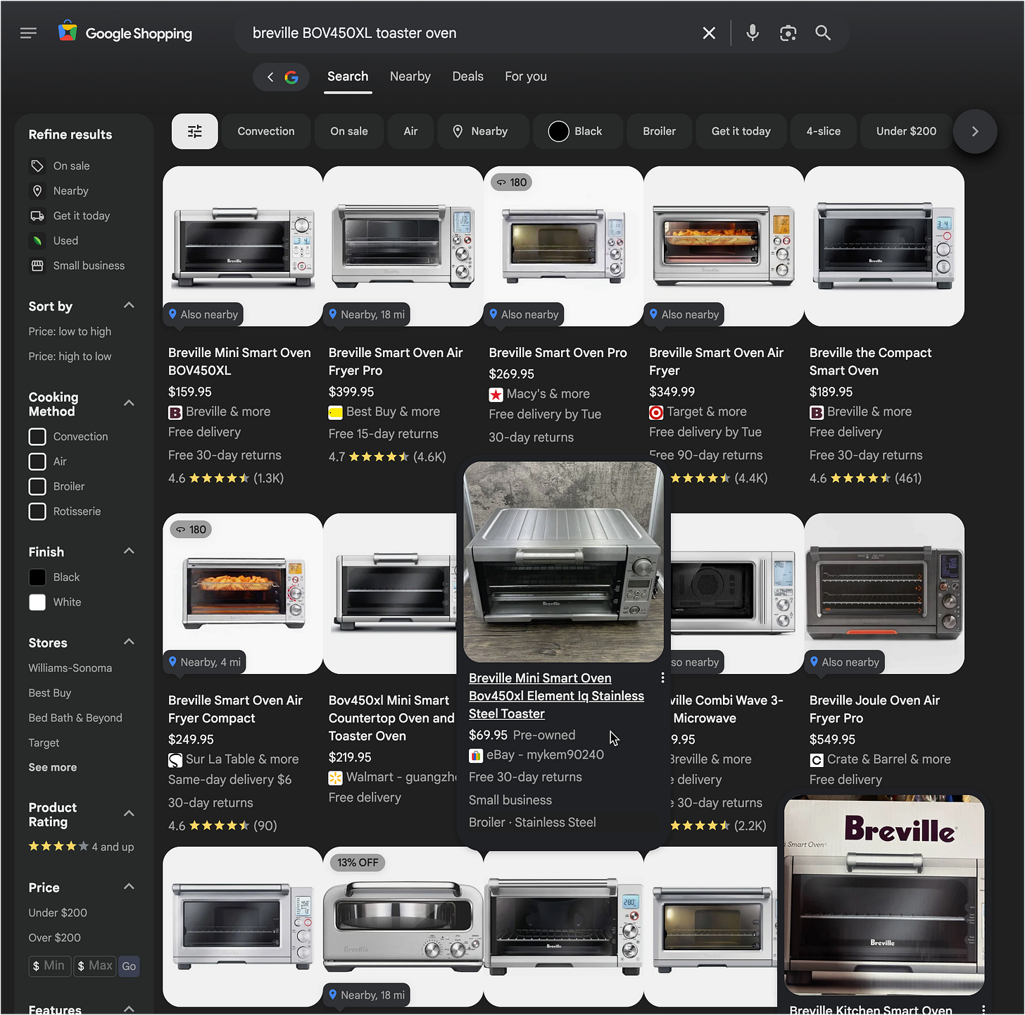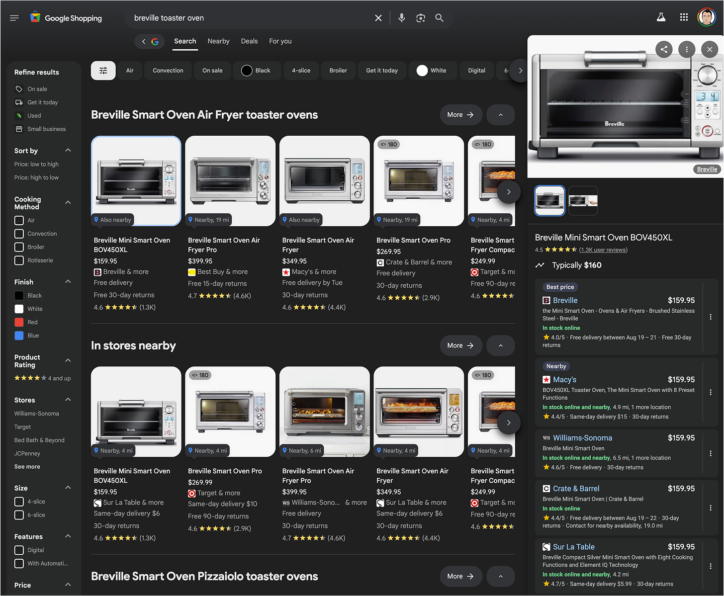 In trad Google, when you enter a query that Google knows is a product, it will interweave and sometimes totally move you over to the GS experience. This is what we call in the industry a traditional Comparison Shopping Engine (CSE) experience. At the ‘research’ level of shopping you get a product card experience with filtered navigation on the top and bottom panes and when you click on it you get a right pane ‘offers’ pop up.