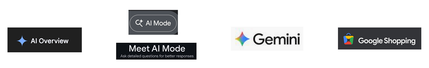There’s four different Google AI expereinces that are distinct and in very different locations. For this conversation and to understand how we predict they will end-up, here’s a quick guide to each of them as we’ve heard frommany readers and brand/retailers I’ve talked to that it’s quite confusing.
