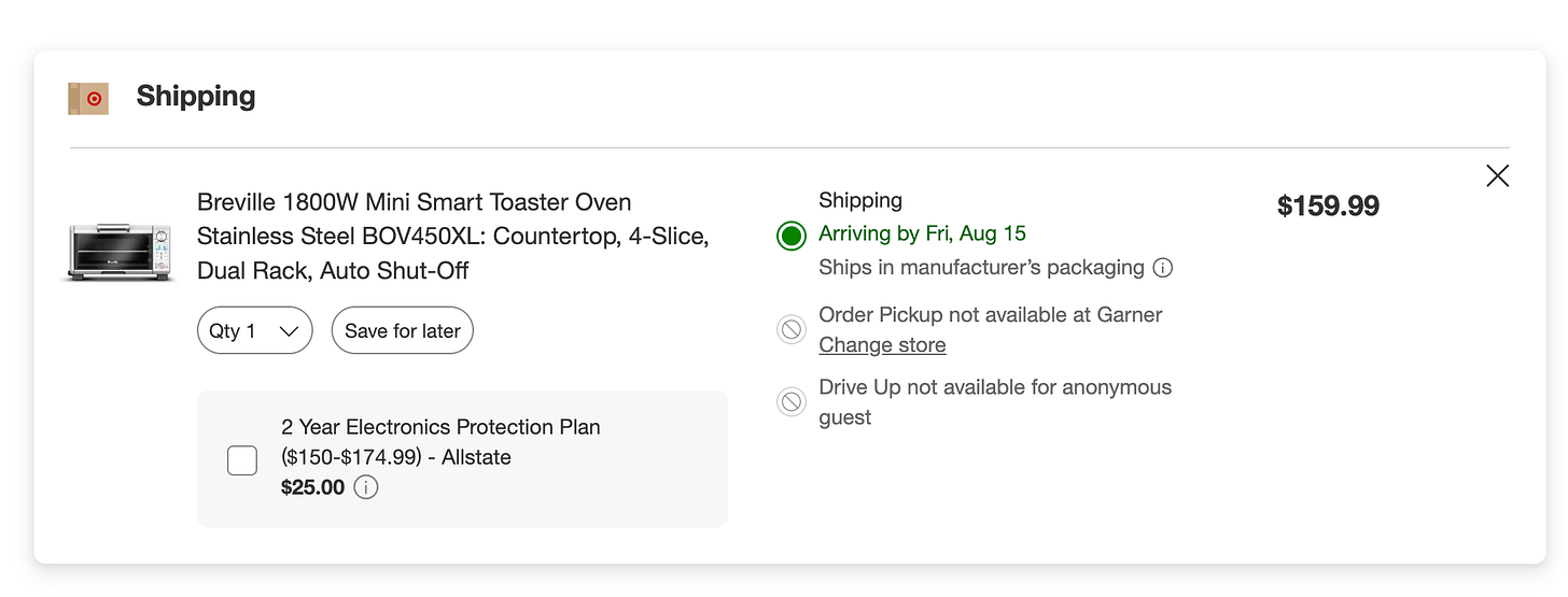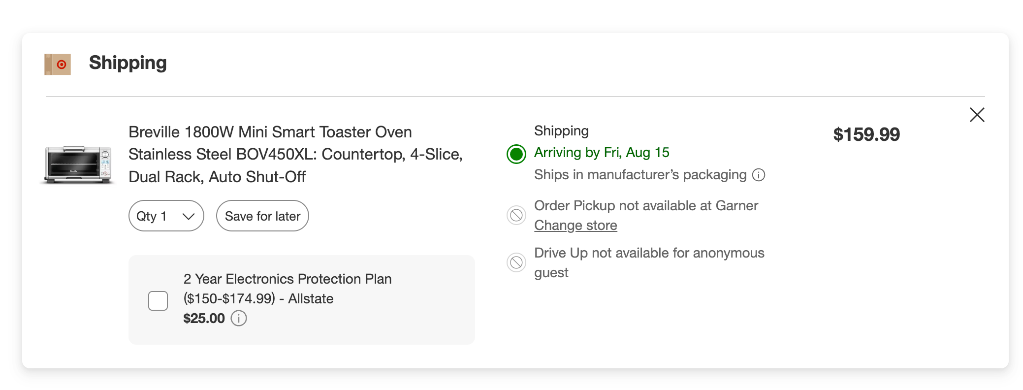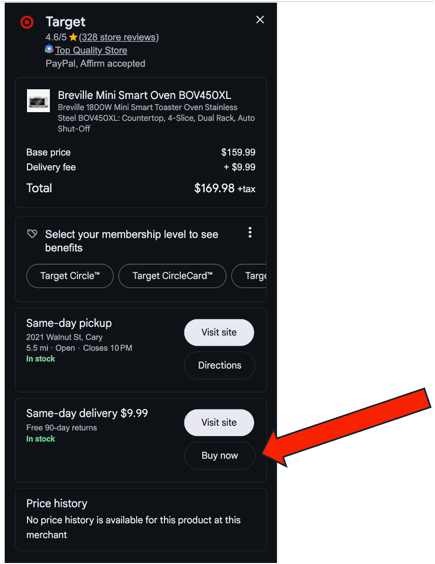 For select retailers (Target for example), you’ll see a ‘Buy now’ button. Don’t get too excited, currently that doesn’t send an agent to buy this for you at Target, but it does do, what we call in the biz, direct cart injection and throws that item into the cart for you and moves you straight to the checkout page.