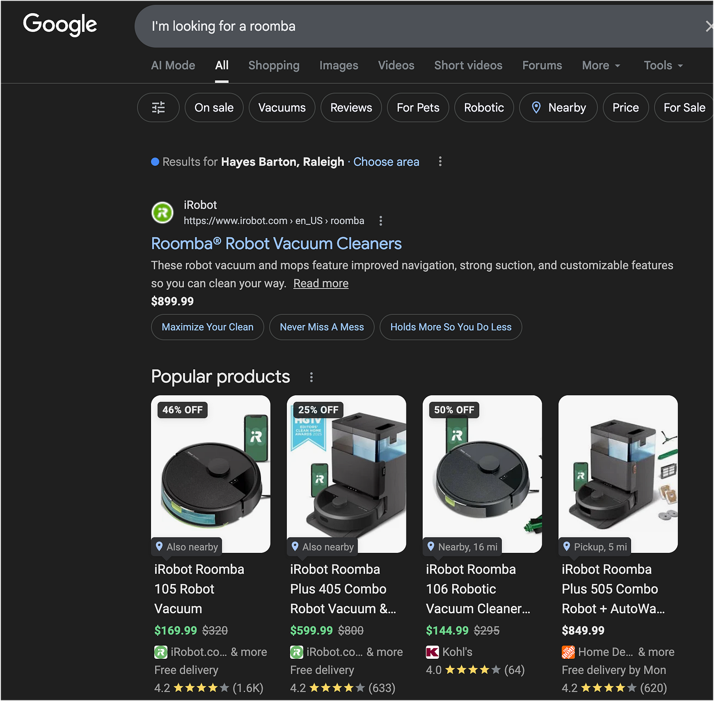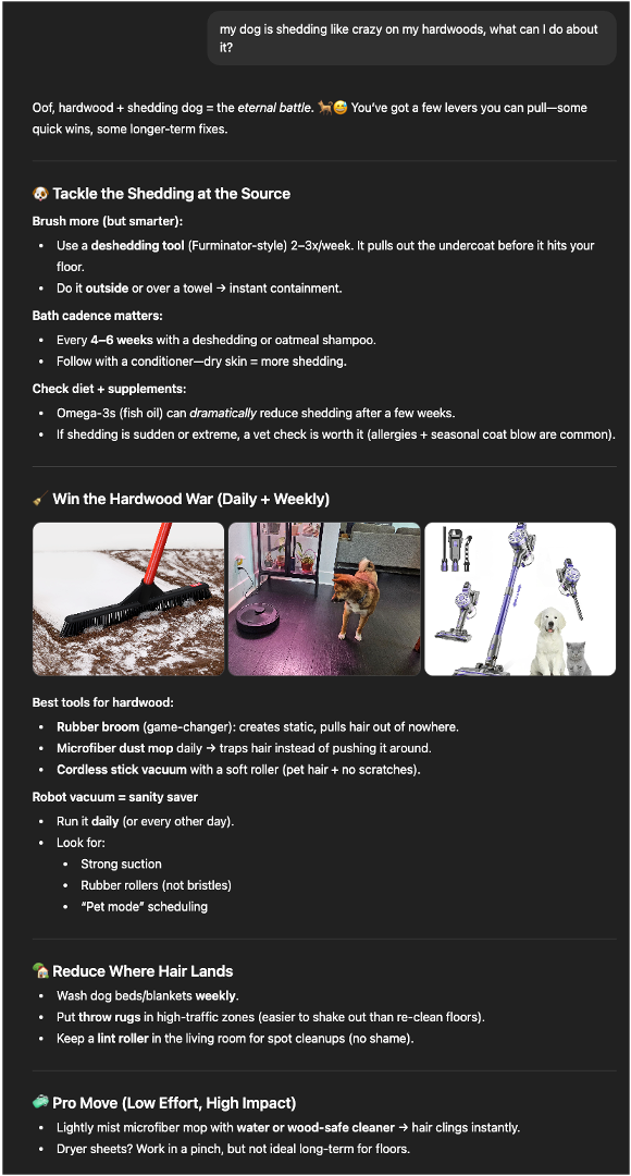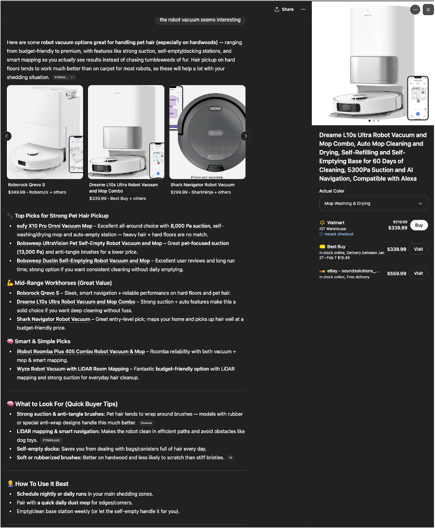 In that discussion, it brings up one of the solutions is a robot vaccuum. I ask the engine about it generally and it recommends products. I look at them and see a great deal→