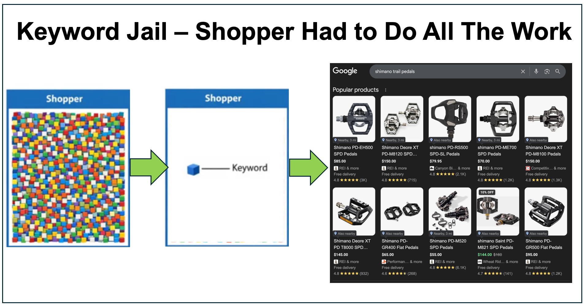 We went from an era where the shopper had to take all their context, boil it down to a 1-4 keywords, search, research through hundreds of products, find the one they want and buy.