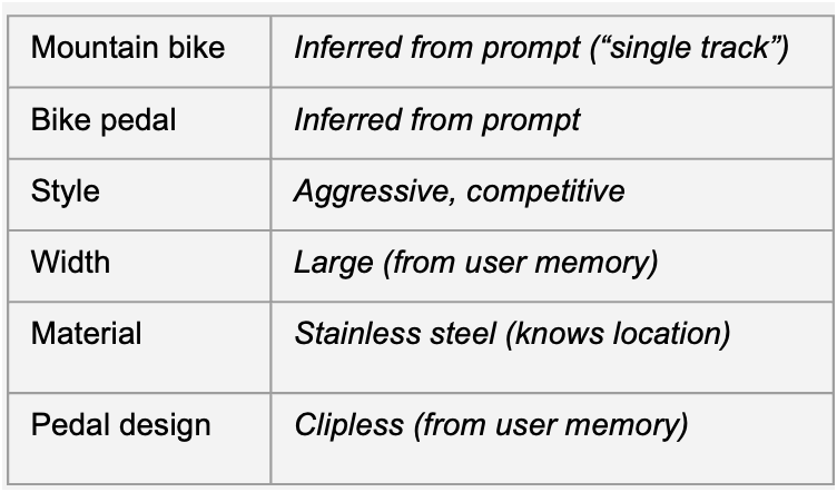 Compatibility - The user knows the brand of mountain bike the user owns because she asked about a chain tightening tip 20 days ago and the engine knows there’s a compatibility check there as well as the shoes - if they had been clip-in that would be higher priority.
