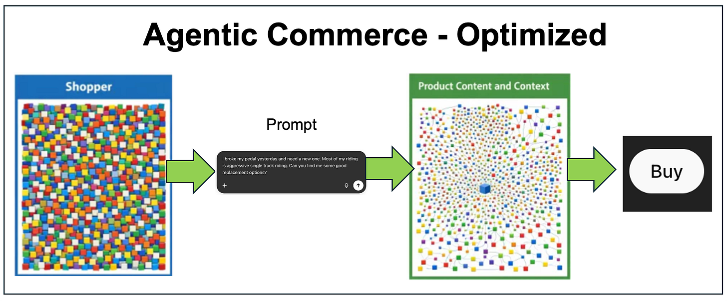 In the Agentic Commerce era, the shopper can give an LLM a prompt that includes some context. Based on that prompt, the user’s past purchases, memory of other facts, the agent does the Research. But it needs the biggest product data with expanded attibutes and extra context to Research, Find and ultimately help Buy the perfect product.